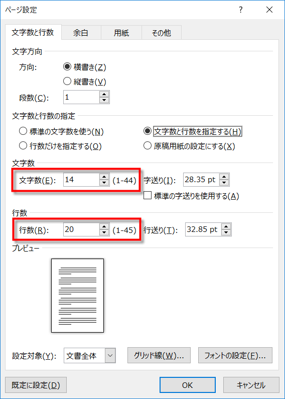以下の赤枠の設定にて、1行の文字数とページ内の行数を設定します。
