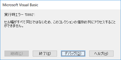 表の1列目なので、Columns(1) プロパティで設定して処理をしたのですが、「実行時エラー 5992 セル幅がすべて同じではないため、このコレクションの個別の列にアクセスすることができません。」というエラーが出ました。