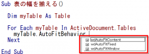 Sub 表の幅を揃える() Dim myTable As Table For Each myTable In ActiveDocument.Tables myTable.AutoFitBehavior wdAutoFitWindow Next End Sub