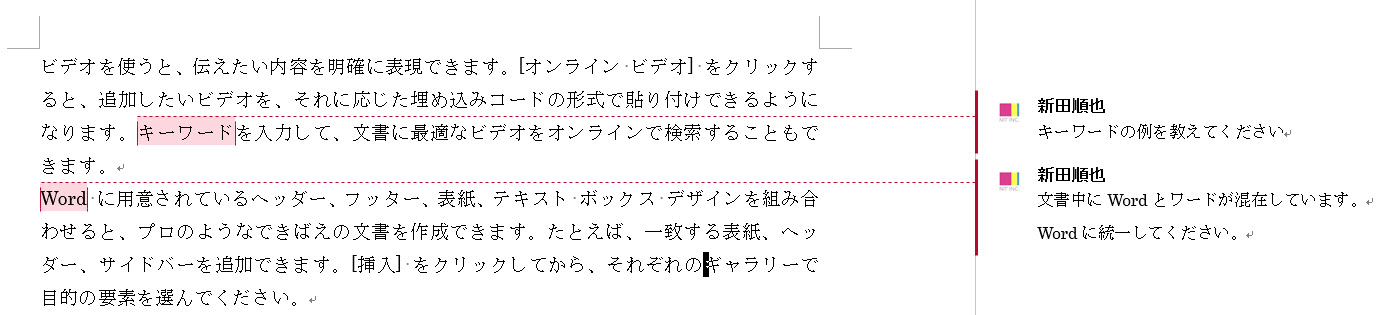 コメントを挿入すると、Wordのユーザー設定で定義されているユーザー名と頭文字がコメントの作成者として設定されます。上記のプロパティは書き換えが可能なので、今回のようにコメント1つ1つの値を変更します。