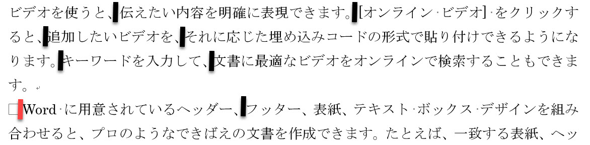下図のようにカーソルが句読点の直後に移動します。移動した箇所が段落の末尾やタブ、スペースの直前だった場合には文章の先頭(つまり、文字列の直前)にカーソルが位置します。前回のマクロとの違いは、下図における赤色の箇所です。