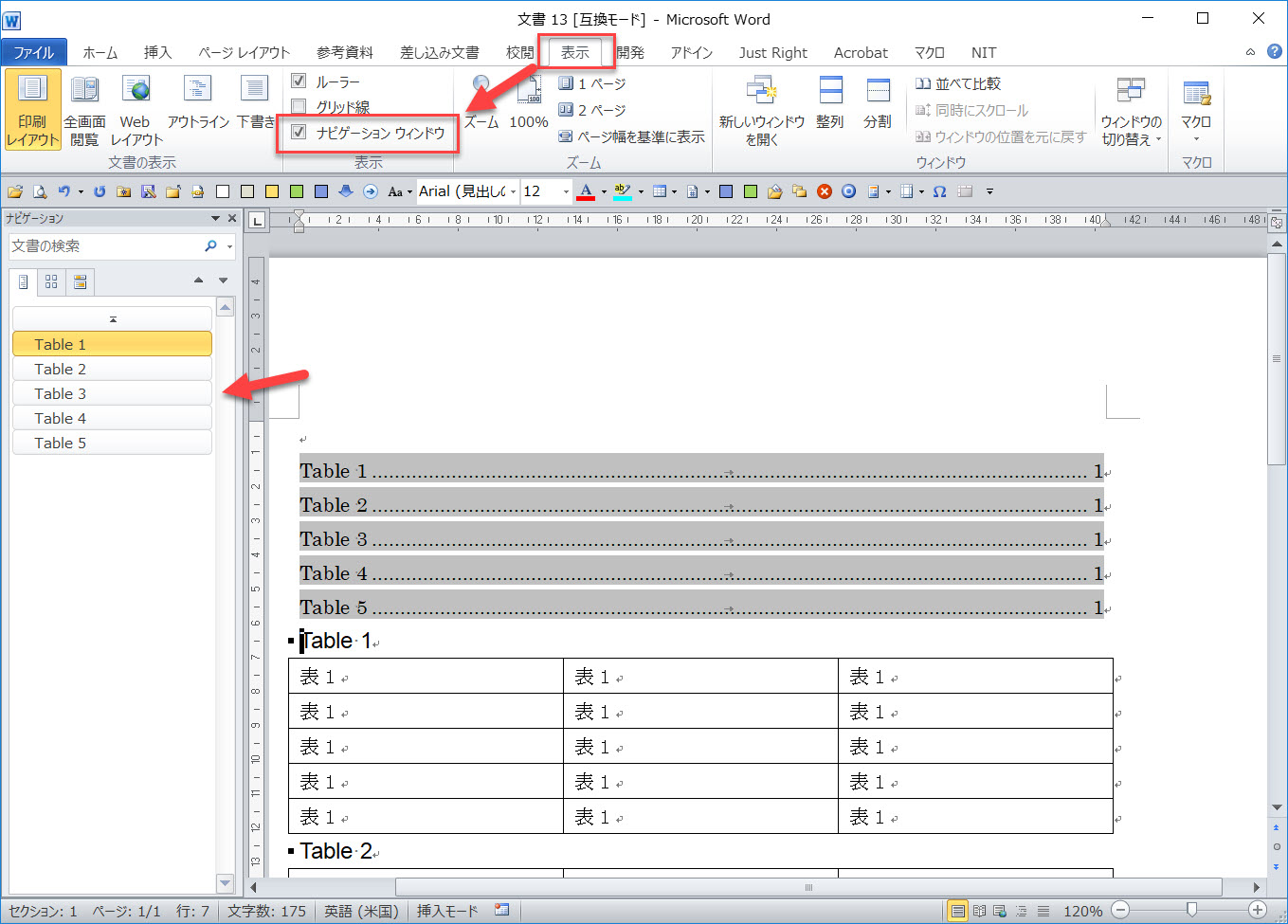 [表示]タブの[ナビゲーションウィンドウ]をオンにすれば、見出しマップが表示されます。ここから対象とする表にジャンプできます。