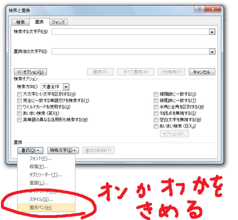 蛍光ペンを使うかどうか(オンかオフか)だけを、[検索する文字列] と [置換後の文字列] のそれぞれに設定します。