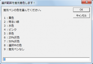 Sub 蛍光ペンで着色_色を選択できる() Dim myColor As String Dim myColorIndex As String Dim myMessage As String 'インプットボックスで表示するメッセージ myMessage = "蛍光ペンの色を選んでください。" & vbCr & vbCr & _ "1:黄色" & vbCr & _ "2:明るい緑" & vbCr & _ "3:水色" & vbCr & _ "4:ピンク" & vbCr & _ "5:赤色" & vbCr & _ "6:25%灰色" & vbCr & _ "7:50%灰色" & vbCr & _ "8:選択中の色" & vbCr & _ "9:蛍光ペンなし" & vbCr '数字を入力するまで実行 Do myColor = InputBox(myMessage, "選択範囲を蛍光着色します!", 1) If myColor = vbNullString Then End Loop While IsNumeric(myColor) = False '選択した色を設定 Select Case CInt(myColor) Case 1 myColorIndex = wdYellow Case 2 myColorIndex = wdBrightGreen Case 3 myColorIndex = wdTurquoise Case 4 myColorIndex = wdPink Case 5 myColorIndex = wdRed Case 6 myColorIndex = wdGray25 Case 7 myColorIndex = wdGray50 Case 8 myColorIndex = wdNoHighlight Case 9 myColorIndex = Options.DefaultHighlightColorIndex End Select '選択範囲を蛍光ペンで着色 Selection.Range.HighlightColorIndex = myColorIndex End Sub