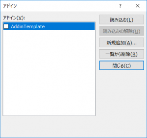 サンプルコードでは、上記のようにアドイン名の「AddinTemplate」と表記していますが、ここにアドインテンプレートのパスを入力してもいいです。