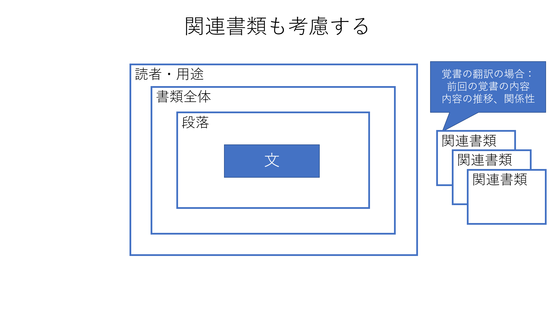与えられた書類に書かれていな情報も考慮します。たとえば、議事録の翻訳では過去の議事録の内容を知っていれば、今回の議事録で使う言葉を選びやすくなります。