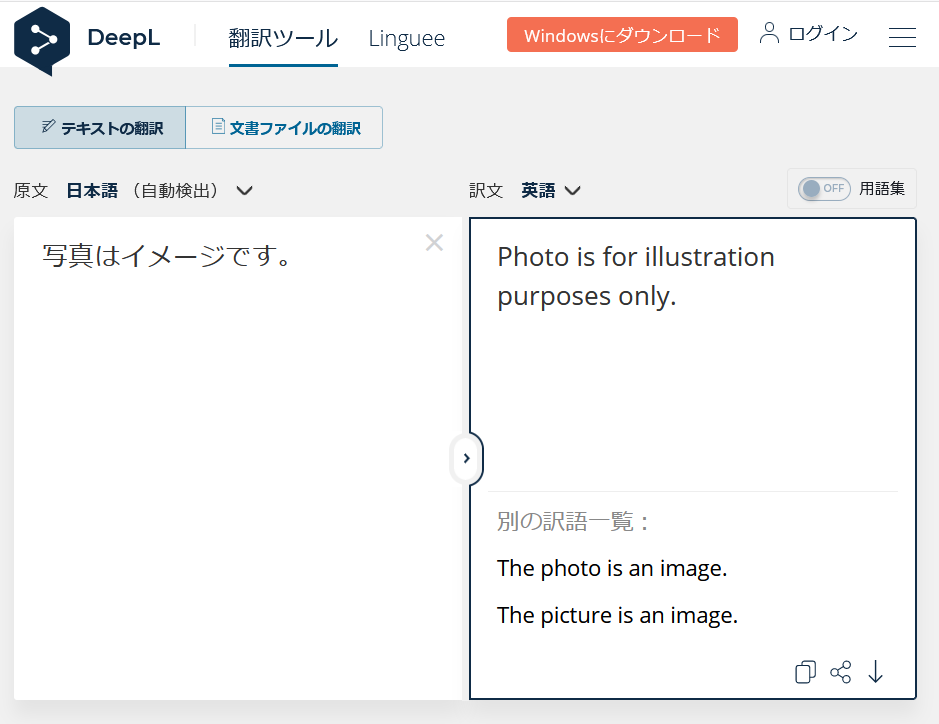 ただ、DeepL翻訳では1つ変化がありました。訳の候補に「写真はイメージです。」が表示されています。やはり、何らかの学習データとの関係性が見られます。