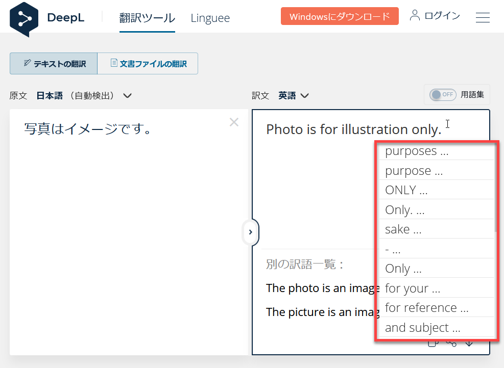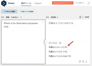 DeepL翻訳では出力した訳文を画面上で修正できます。たとえば、「Photo is for illustration only.」がしっくりしないと感じる場合には、文中の単語をクリックすると修正候補が表示されるのです。