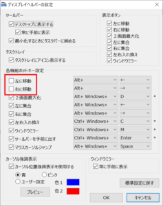 起動したダイアログで以下の赤枠の2つをオフにします。これが[Alt]+[←](または、[→])に設定されています。