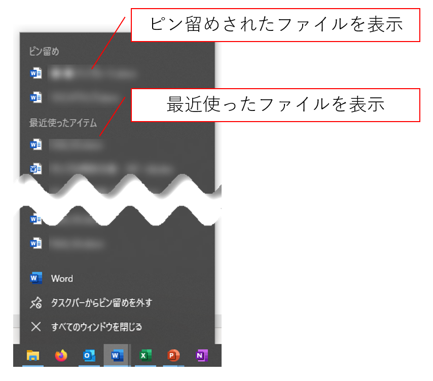 この「ピン留め」は、タスクバーのジャンプリストでも使えます。タスクバーに表示されたアプリケーションのWordのアイコン上で右クリックします。以下のように、最近使ったファイルの一覧が表示されます。ここにも、ピン留めされたファイルが表示されるのです。