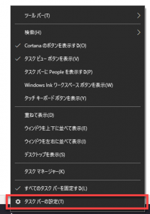 Windows 10では以下のような操作方法になります。タスクバーで右クリックをすると以下のメニューが表示されるので、[タスクバーの設定]をクリックします。