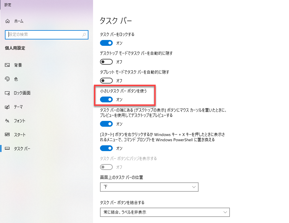 表示されたダイアログで[小さいタスクバーボタンを使う]をオンにします。