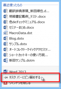 アプリケーションを開いたときにタスクバーに表示されるアイコンを右クリックします。すると以下のように「タスクバーにピン留めする」という項目が表示されます。これをクリックします。(Windows 7の場合、「タスクバーにこのプログラムを表示する」と表示されます)