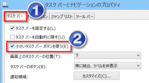 表示されたダイアログボックスの[タスクバー]のタブの[小さいタスクバーボタンを使う]のチェックを入れます。[OK] ボタンをクリックして閉じます。これでタスクバーのボタンが小さくなります。