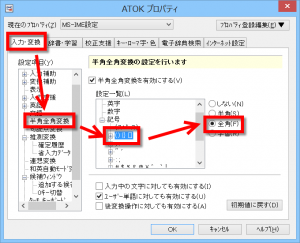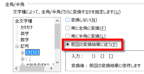 変換時に全角になってしまう理由は、上記のように括弧の変換が「全角」に設定されているからなのです。あー、そういえばここいじった覚えがある(笑)。