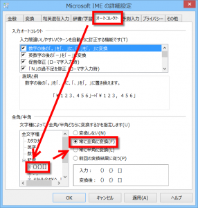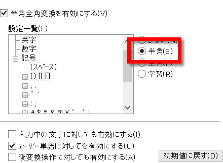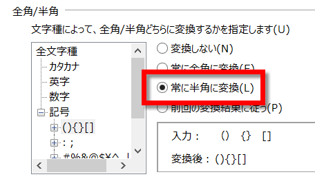 以下のように「常に半角に変換」に設定を変更します。