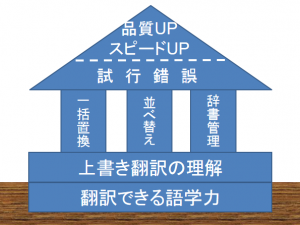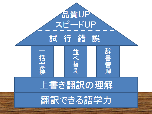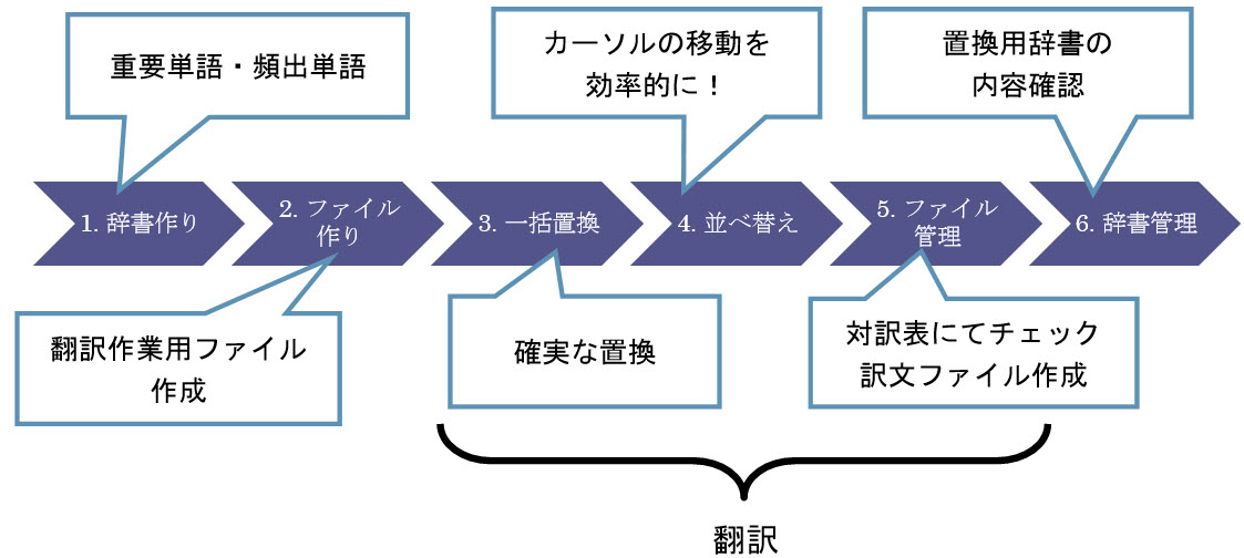 「一括置換のスキル」と、「語句を並べ替えて訳文を作成するスキル」と「用語管理のスキル」をお伝えします。これらは3つ相互に関連していますので、その関連性を考えながら業務の中で何をすべきか考えていきます。
