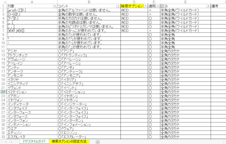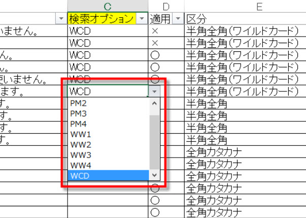 検索オプションの列(C列)を空欄にした場合には、「半角と全角を区別する」がオンになった状態で検索します。