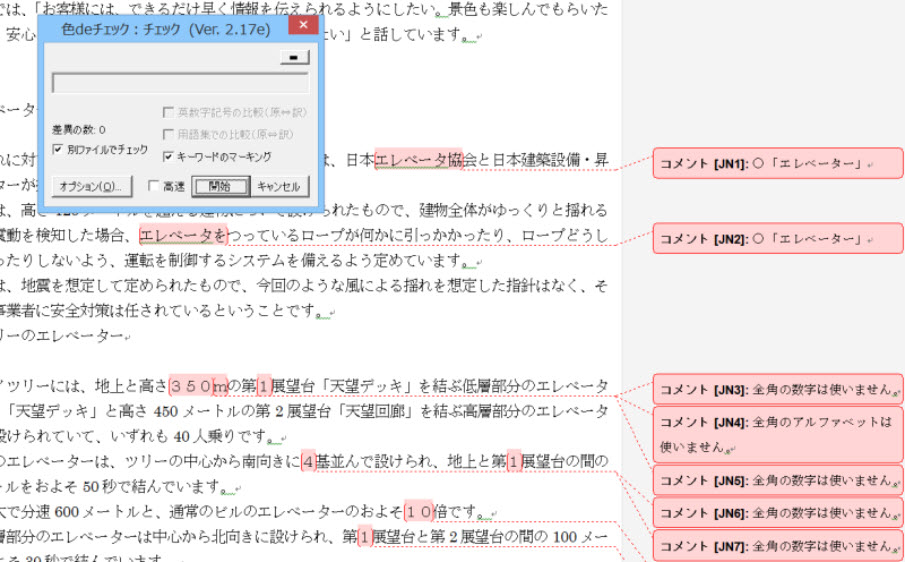 以下のように、スタイルガイド違反リスト(NGワードリスト)に記載された語句を探してマーキングしたりコメントを挿入したりできます。