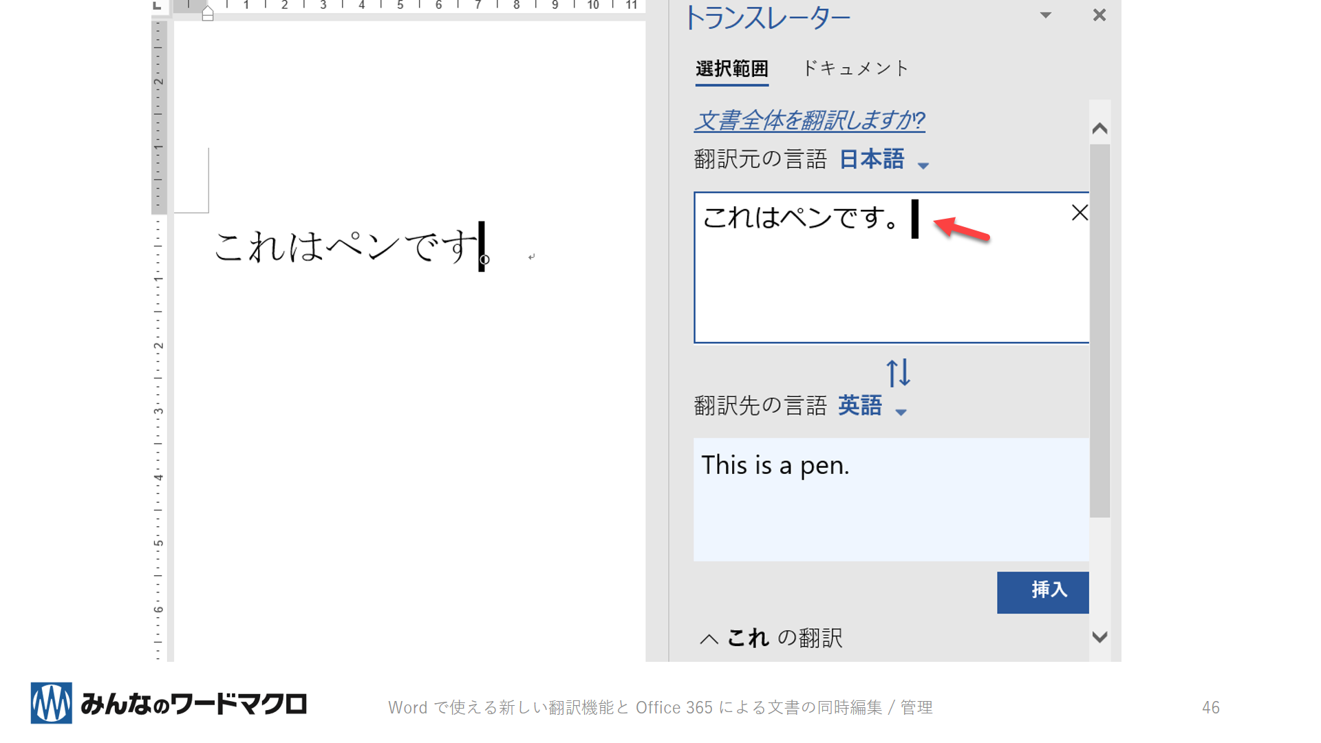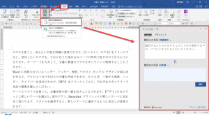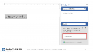 Wordに標準で搭載されているMicrosoft Translatorです。右側の作業ウィンドウで文字を修正できます。