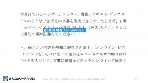 さて、ファイルの「同時編集」ですが、Word 2016ではデスクトップ上で実行できます。リアルタイムで遠隔地の共同作業者とともにファイルを編集できるのです。共同作業者のカーソル位置が見えるし、文字入力時には共同作業者の変換ミスまで見えたりします。
