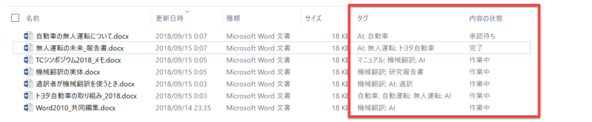 例えば、Wordファイルが作業中なのか完了したのか、担当者名、客先名、分野など。