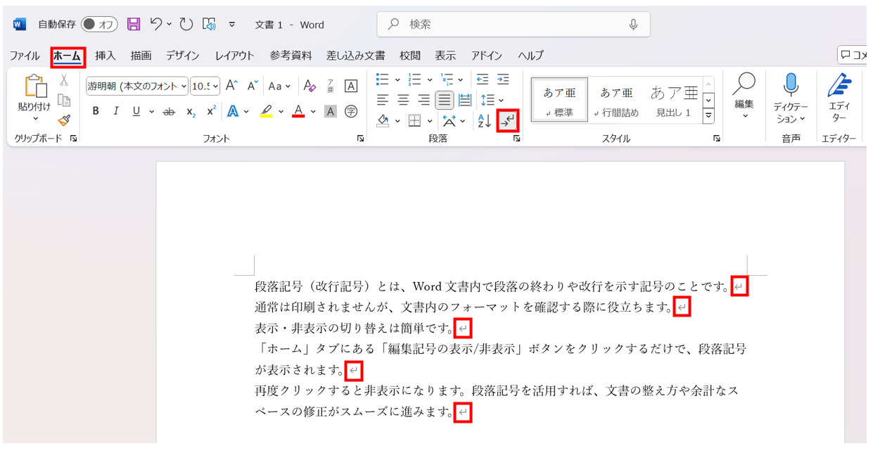 HOME > 段落記号 段落記号 段落記号の表示と非表示 段落記号とは、Word文書内で段落の終わりや改行を示す記号()のことです。通常は印刷されませんが、文書内のフォーマットを確認する際に役立ちます。改行記号とも呼ばれていますが、正式名称は段落記号です。 表示・非表示の切り替えは簡単です。[ホーム]タブにある[編集記号の表示/非表示]ボタン()をクリックするだけで、段落記号が表示されます。再度クリックすると非表示になります。段落記号を活用すれば、文書の整え方や余計なスペースの修正がスムーズに進みます。 関連記事