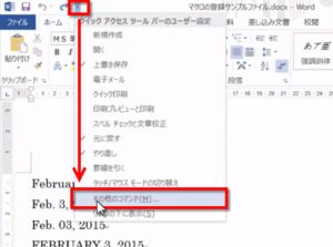 以下のようにクイックアクセスツールバーの右端にある▼をクリックしてドロップダウンメニューを表示し、その中の[その他のコマンド]をクリックします。