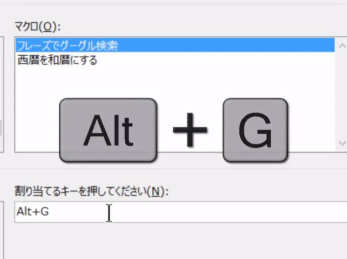 今回の記事では、WordからGoogleのフレーズ検索を実行するマクロ(【Wordマクロ】ワード画面からグーグル”フレーズ”検索するマクロ)を [Alt] + [G] で実行する方法を紹介します。