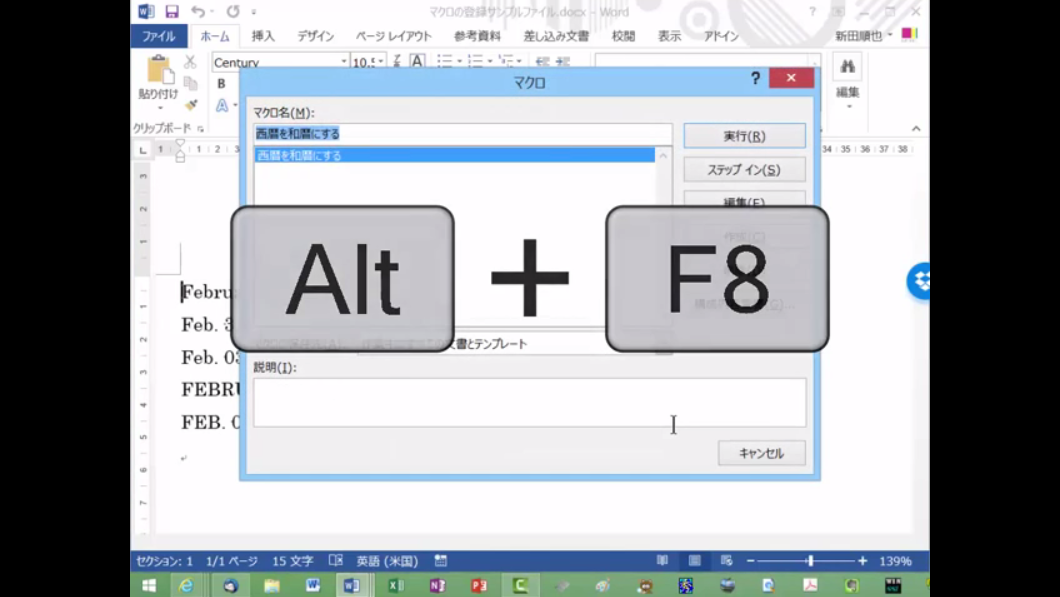 登録したマクロを[F8] で開く[マクロ]ダイアログボックスで選択して実行します。