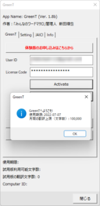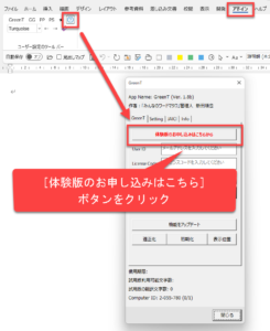 GreenTのインストールに成功したら、[アドイン]タブの[?]ボタンからライセンスの登録用ダイアログを起動します。