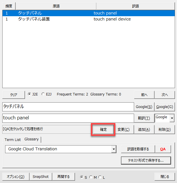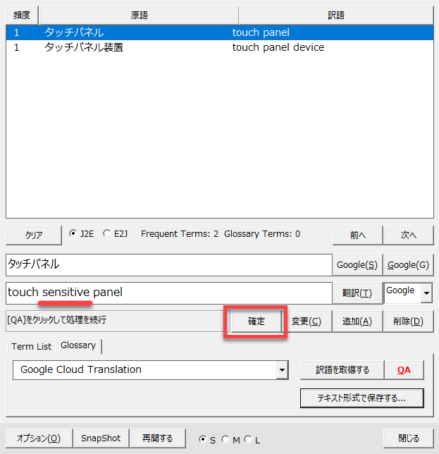 [確定]ボタンは、訳語を修正する際にも修正しない際にもどちらでも使えます。このボタンをクリックすると、選択されている項目をQAチェックの判定に用いるように設定します。