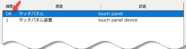 この結果、訳語が修正されこの項目に[OK] マークが付きます。[変更]ボタンをクリックしたときの「他の用語に修正を適用する機能」はないので、「タッチパネル装置」の「touch panel」はそのままになっています。