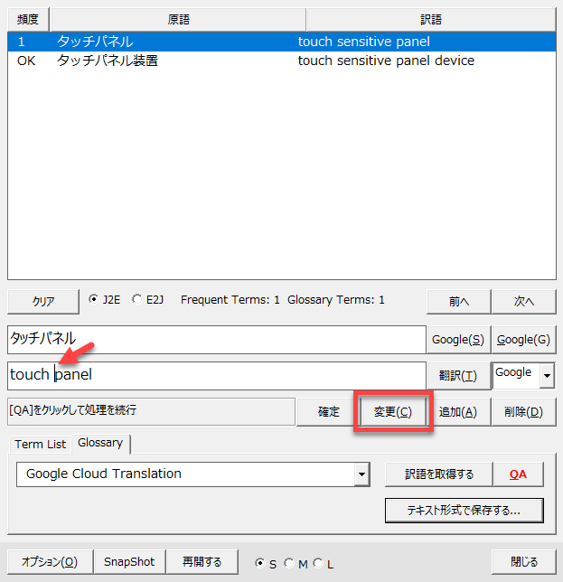 訳語を「touch sensitive panel」に変更して[変更]ボタンをクリックします。