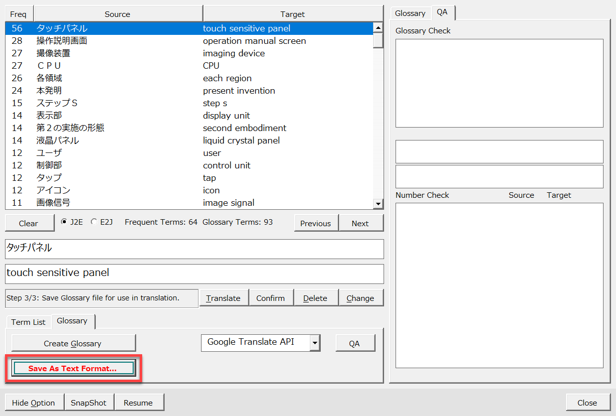 ここで登録した用語が後の機械翻訳に用いられてQAチェックにも使われます。