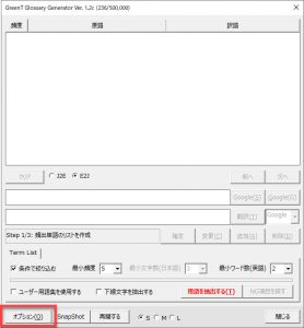 [アドイン]タブの[GG]ボタンをクリックして[Glossary Generator]ダイアログを開き、左下の[オプション]ボタンをクリックします。