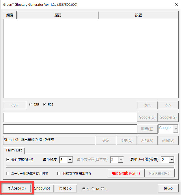 用語集を作成するために、まず所定のルールに基づいて原文から名詞句を自動的に抽出します。このルールは、名詞句の「使用頻度」と「文字列の長さ(英語であれば単語数、日本語であれば文字数)」です。これは、手持ちの用語集を使用しない用語集作りと同じです。
