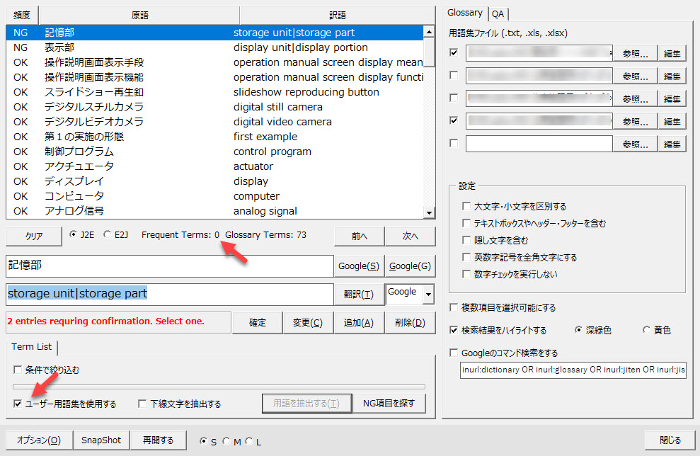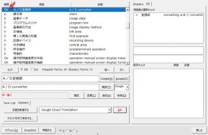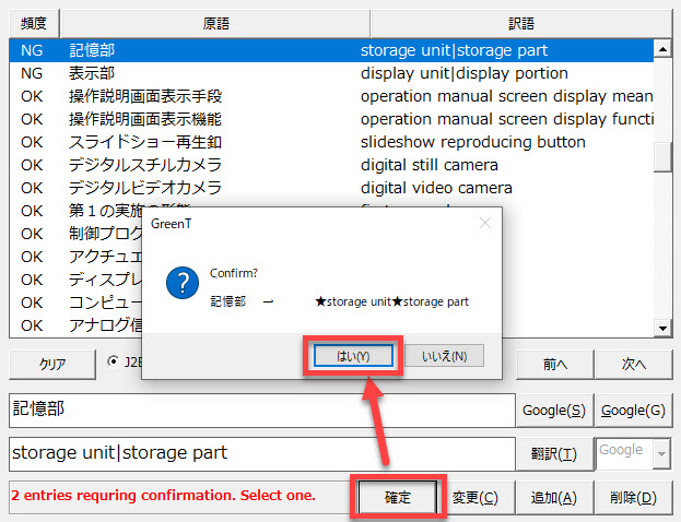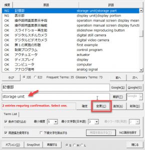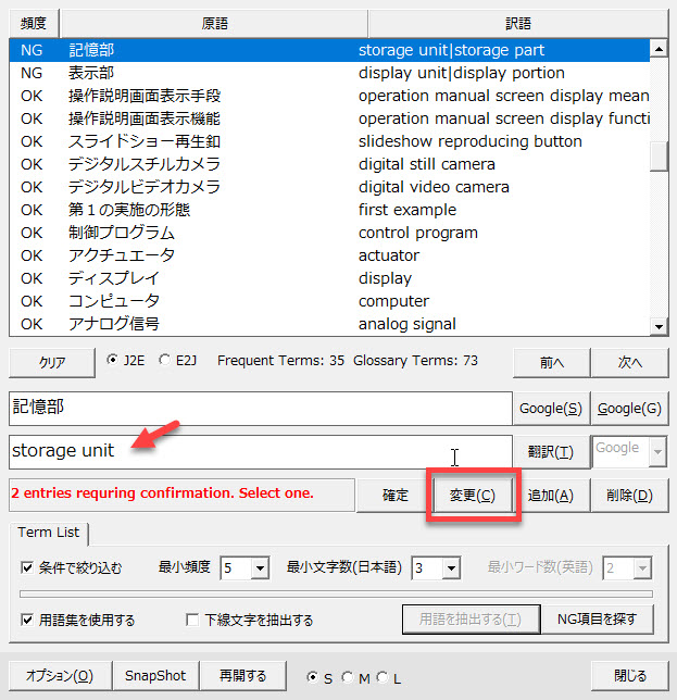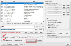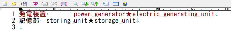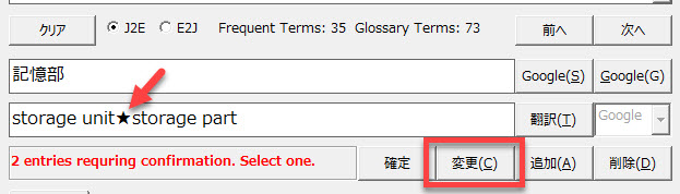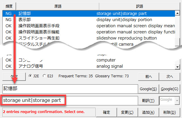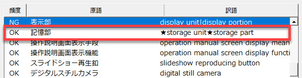 上記の例では、「記憶部」という原語に対して、「storage unit|storage part」と | で区切られた2つの訳語が表示されています。