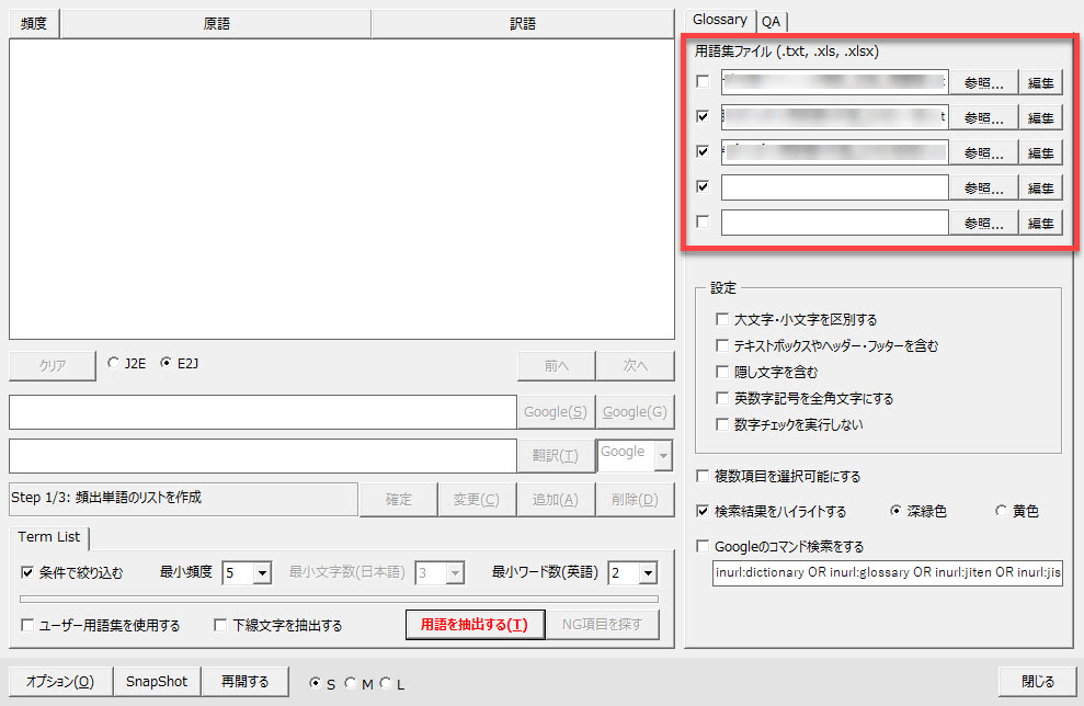 手持ちの用語集を用いる場合には、自動抽出される名詞句に加えて、用語集に記載のある用語をすべて抽出します。[Glossary Generator]ダイアログで用語集を用いる場合、この用語集内の「文書中で1回以上使用される用語」を抽出できます。固有名詞や物質名は使用頻度が少なくても重要ですので、手持ちの用語集を使えば確実に拾えます。