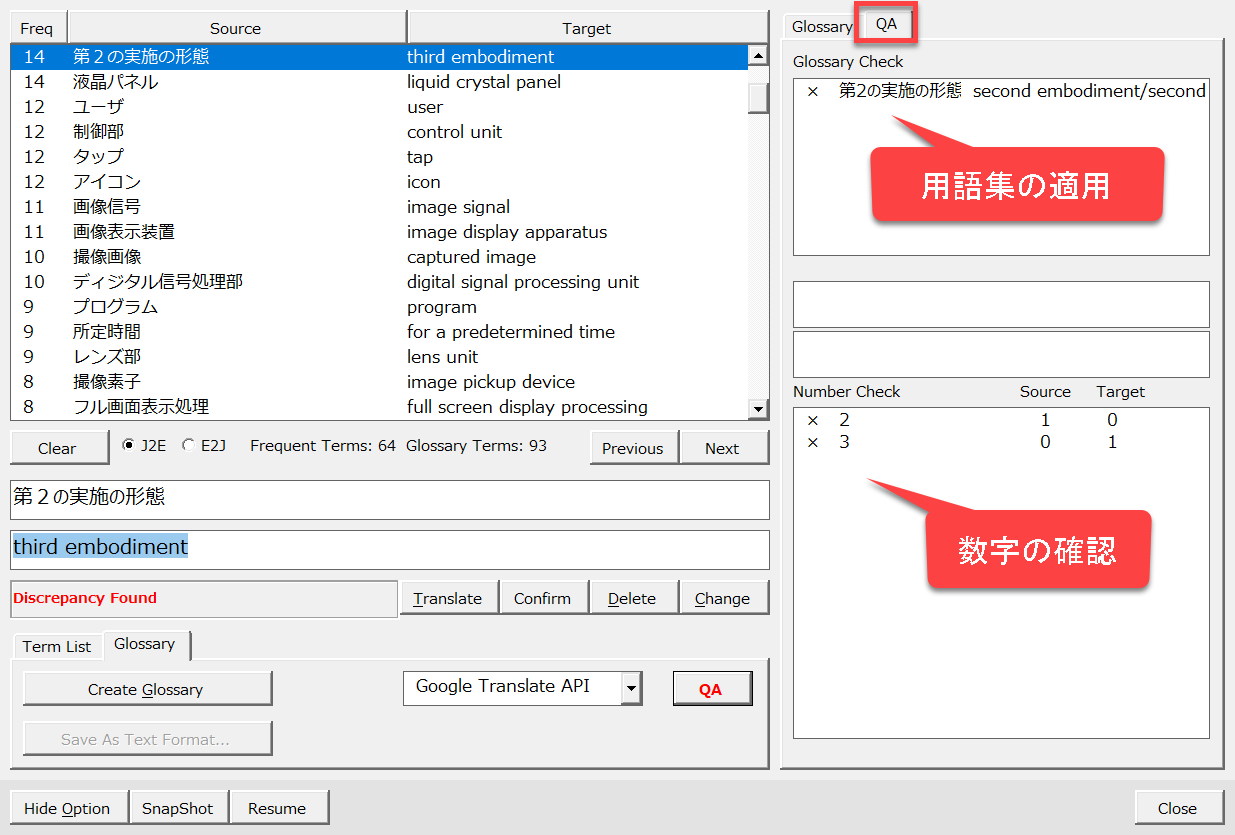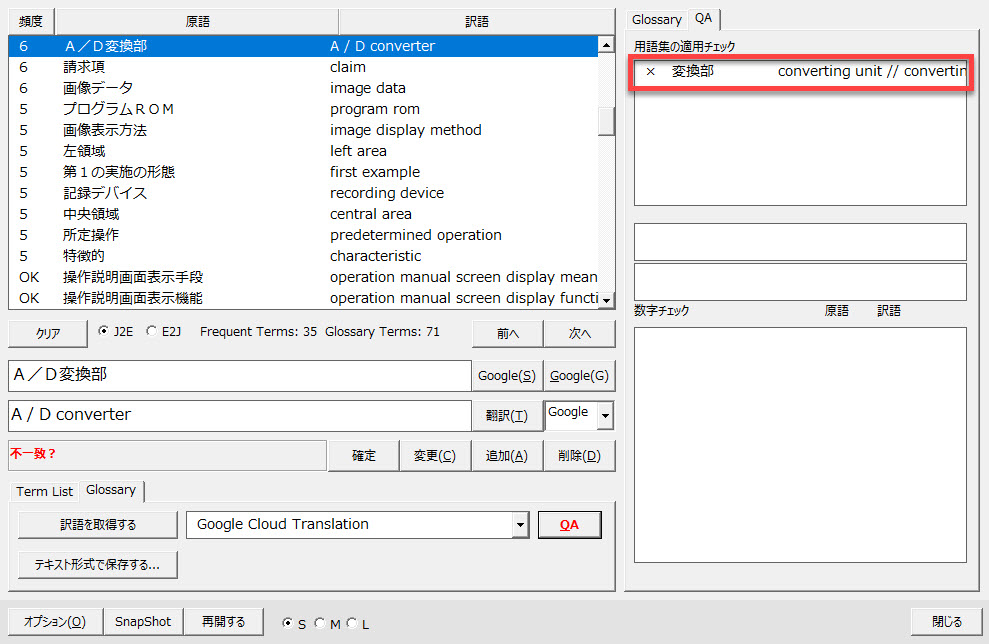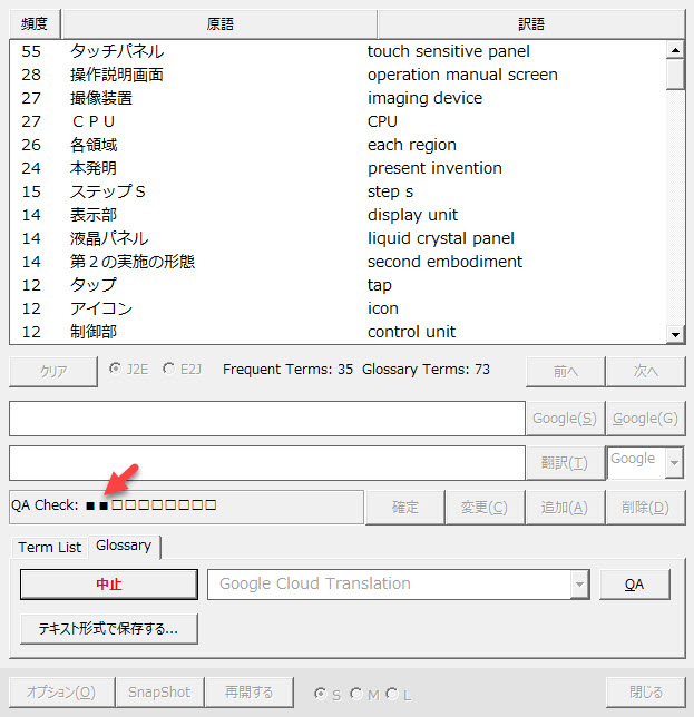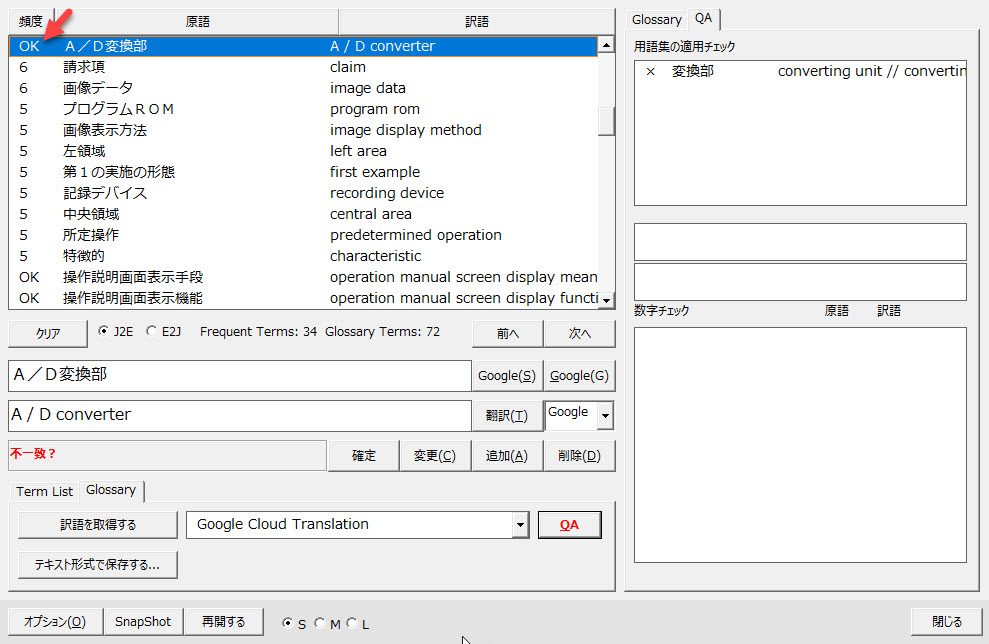 QAチェックでは、原語の数字と訳語の数字が間違っていないか、また手持ちの用語集で用いられている訳語([OK]が表示されている訳語)が別の訳語に反映されているか?をチェックします。