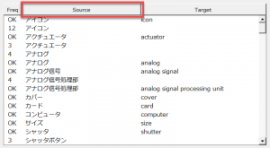 また[原語]ボタン([Source]ボタン)と[訳語]ボタン([Target]ボタン)を用いて用語を並べ替えてみて、必要に応じて他の用語との表記の統一をしてください。