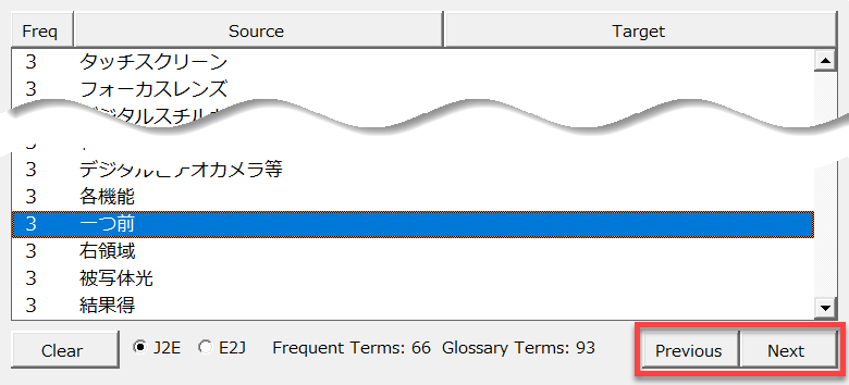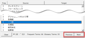 手持ちの用語集を使用しない用語集作りでも説明したとおり、それぞれの名詞句を[前へ]ボタン([Previous]ボタン)と[次へ]ボタン([Next]ボタン)を用いて文書中でどのように使われているのか確認して用語集に入れるべき言葉なのかを検討してください。