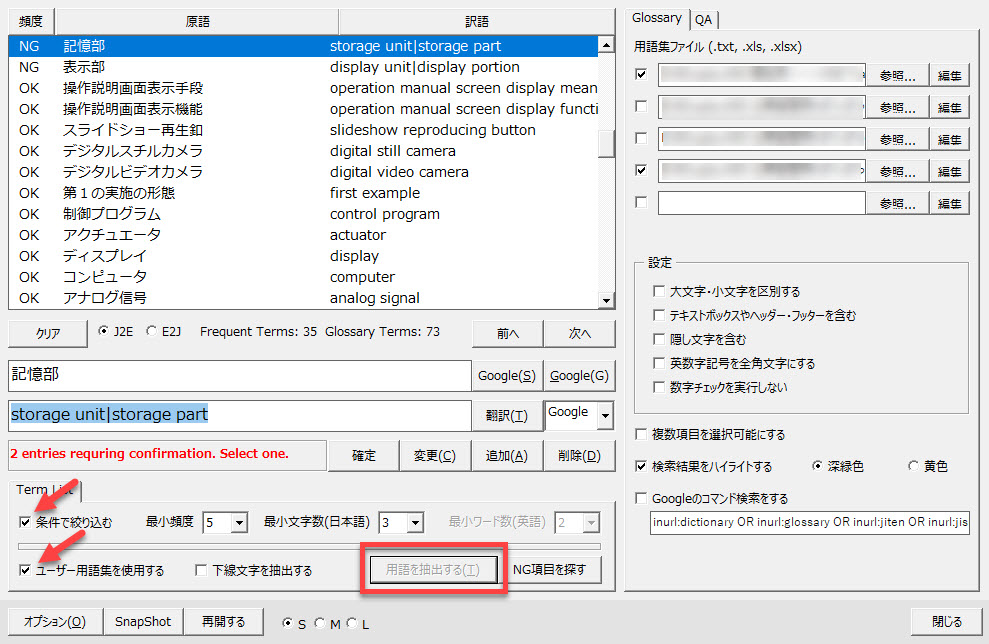 抽出された名詞句がすべて用語集にふさわしいとは限りません。そもそも訳語を特定できないような言葉が抽出されていることがあるからです。