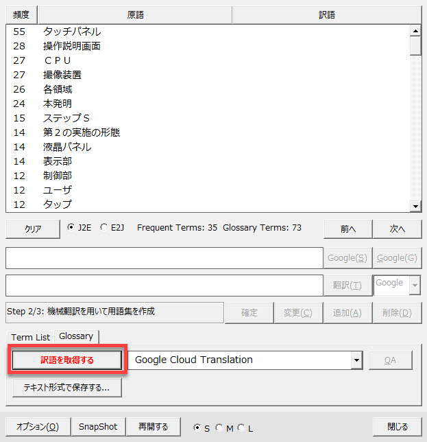 準備ができたら訳語を出力します。[訳語を取得する]ボタンをクリックします。