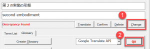 修正した後に[変更]ボタン([Change]ボタン)で確定し、[QA]ボタンをクリックしてQAチェックを続行します。エラーが出なくなるまで繰り返します。
