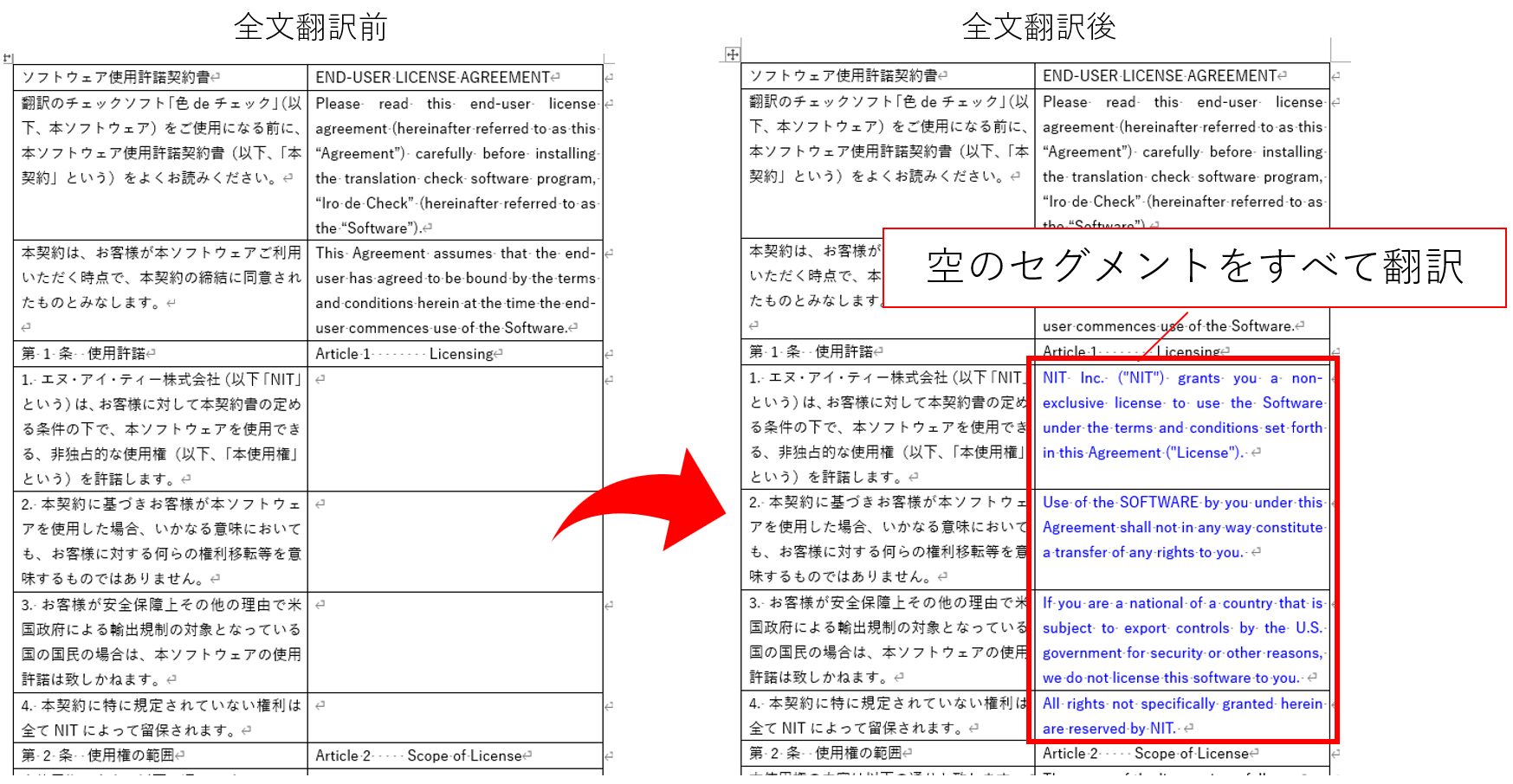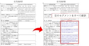 通常の全文翻訳機能では、バイリンガルファイル(対訳表)を対象にした場合、以下のように空のセグメントのみをすべて翻訳します。