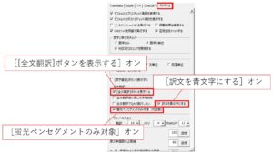 そして、[訳文を青文字にする]をオンにして、全文翻訳でGreenTによる訳文を青文字に着色します。
