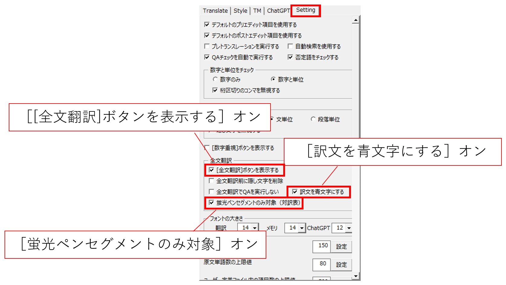 まず、[Setting]タブで、[[全文翻訳]ボタンを表示する]をオンにします。これは、全文翻訳機能を使う場合には必須の設定です。