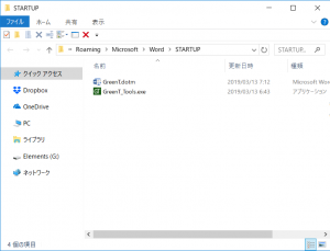 4.このフォルダに新しい「GreenT.dotm」と「GreenT_Tools.exe」をドラッグして移動します。「GreenT.dotm」と「GreenT_Tools.exe」をコピーして貼り付けてもかまいません。