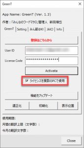 1台目と同じ操作をします。同じダイアログを開きます。1台目で使ったユーザーIDとライセンスコードを使い、[ライセンスを複数のPCで使用]チェックをオンにして[Activate]ボタンをクリックします。